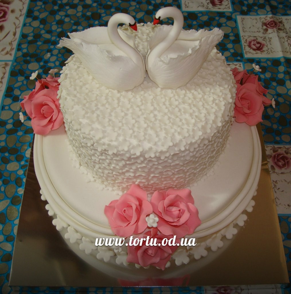 Торт лебеди с драпировкой и розами